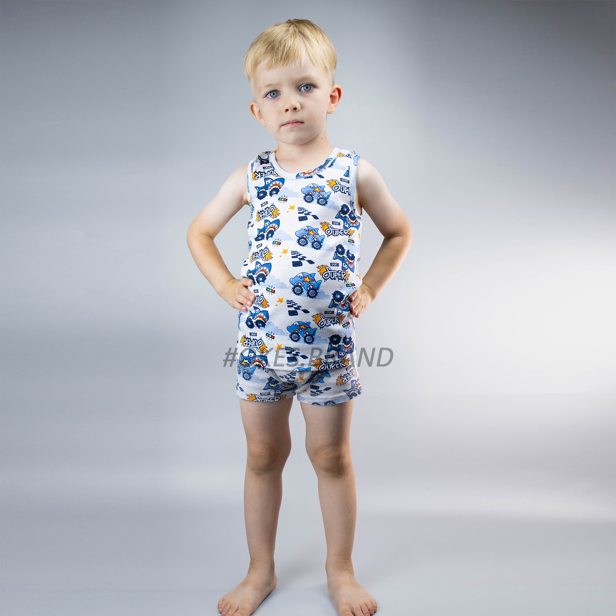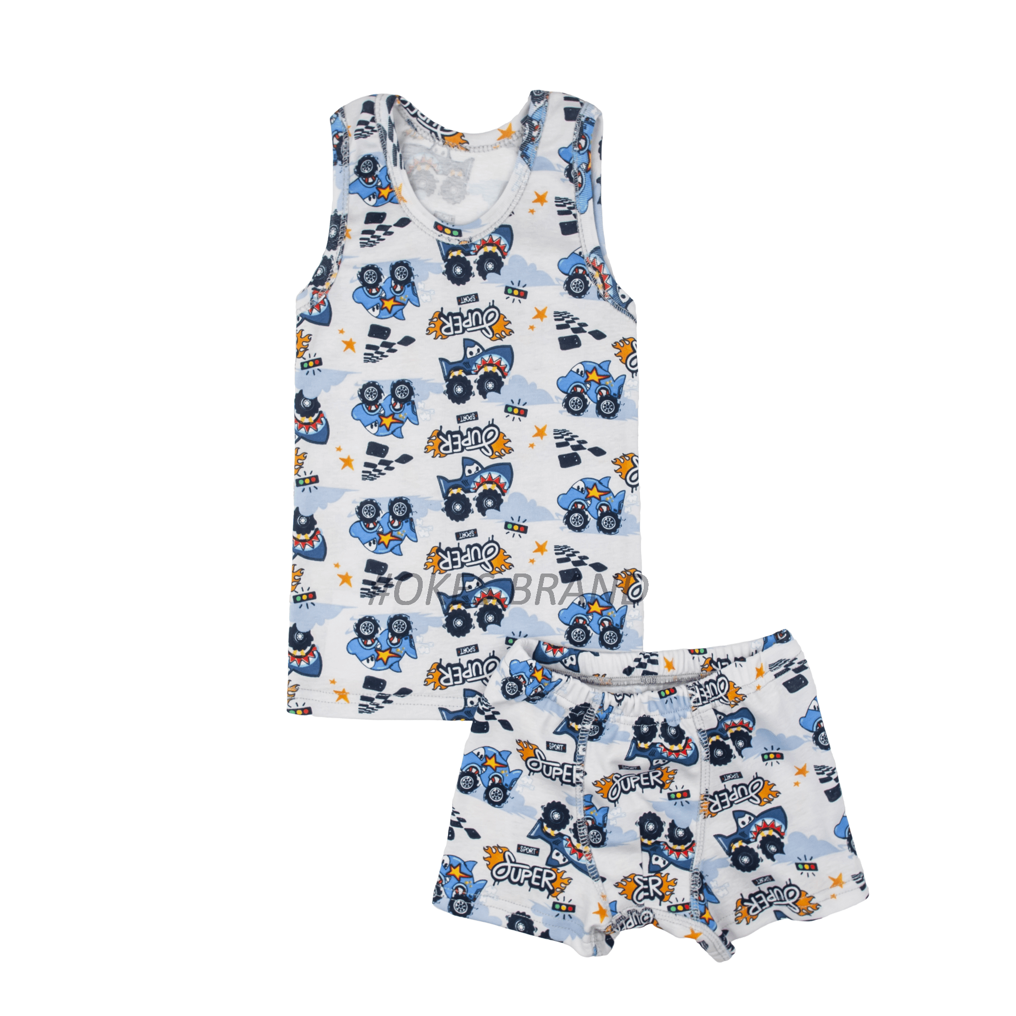 Дизайн цього комплекту просто вражає – на кожній майці та боксерах зображені машинки з акулами, які допоможуть малюкові зануритися у світ фантазій та пригод. Яскраві кольори та доброзичливі образи створюють відмінний настрій та підіймають дитячий настрій на весь день.