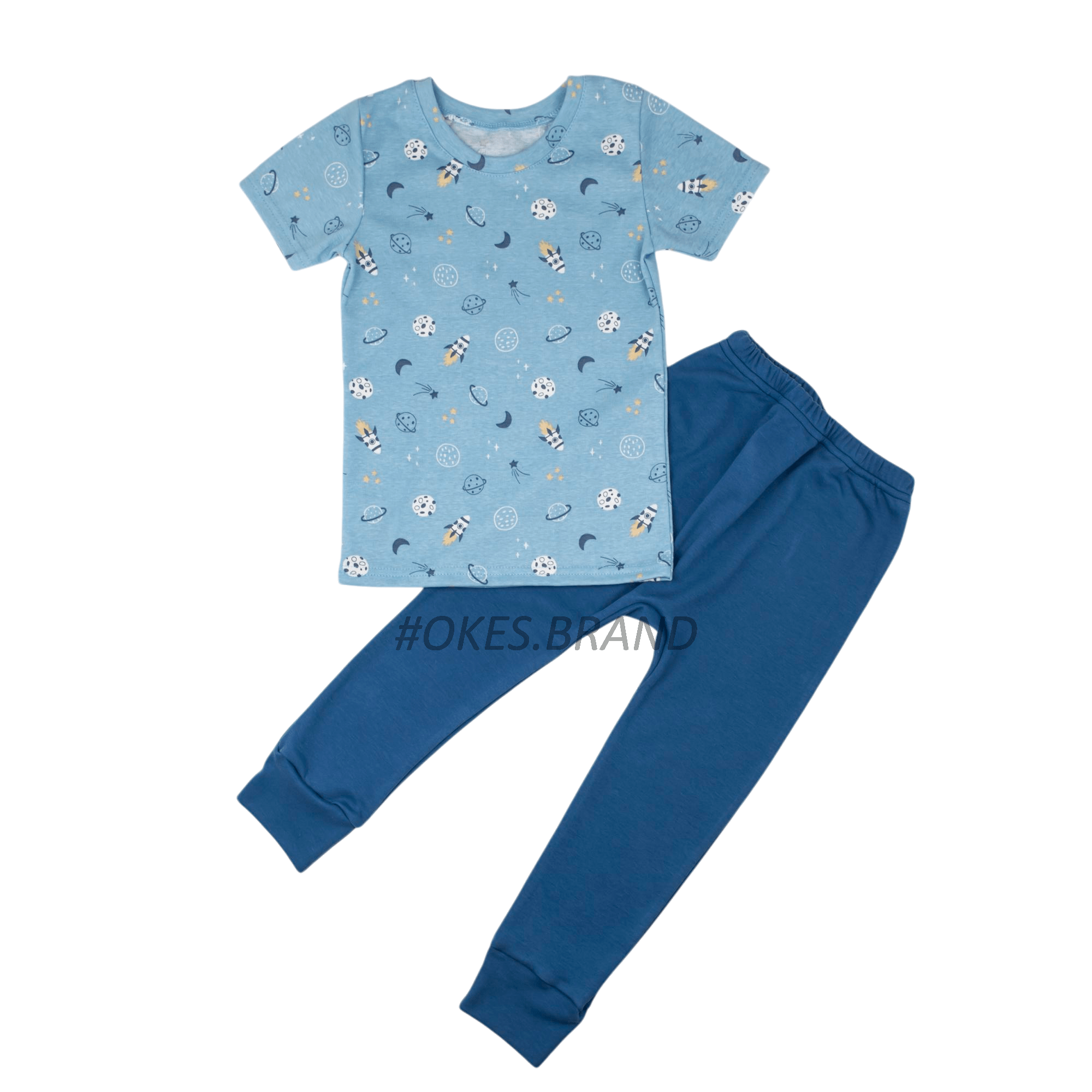 Футболка у блакитних тонах має малюнки космічної теми, що робить її особливо привабливою для маленьких мрійників. Штани зроблені з високоякісного інтерлоку синього кольору, що дозволяє шкірі дихати та не викликає дискомфорту навіть у спекотні дні.