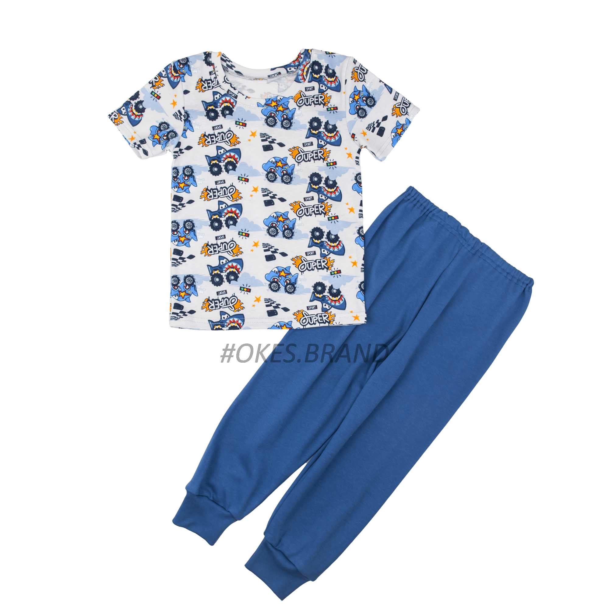 Футболка у сірих тонах має малюнки машинок-акул, що робить її особливо привабливою для маленьких модників. Штани зроблені з високоякісного інтерлоку синього кольору, що дозволяє шкірі дихати та не викликає дискомфорту навіть у спекотні дні.